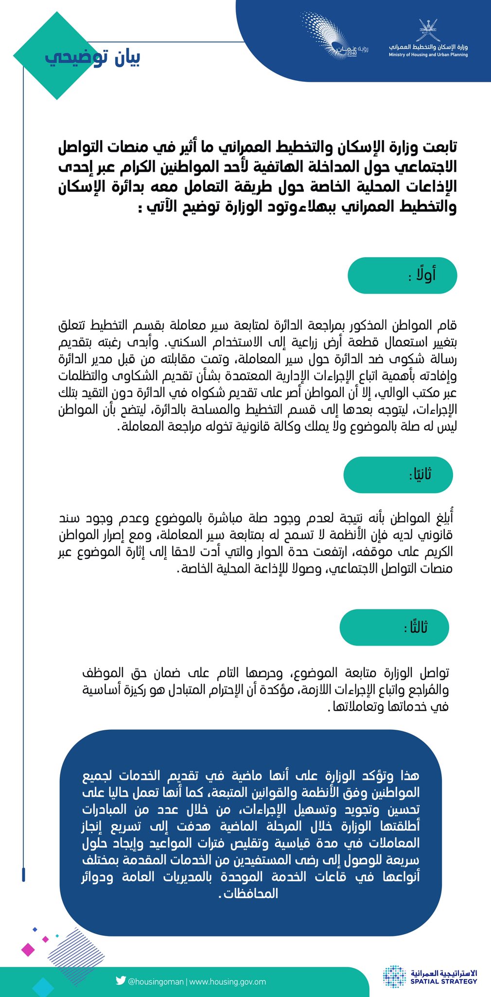 وزارة الإسكان والتخطيط العمراني ع مان On Twitter بيان توضيحي من الوزارة حول ما أثير في منصات التواصل الاجتماعي بشأن المداخلة الهاتفية لأحد المواطنين عبر إحدى الإذاعات المحلية الخاصة وتؤكد أنها ماضية