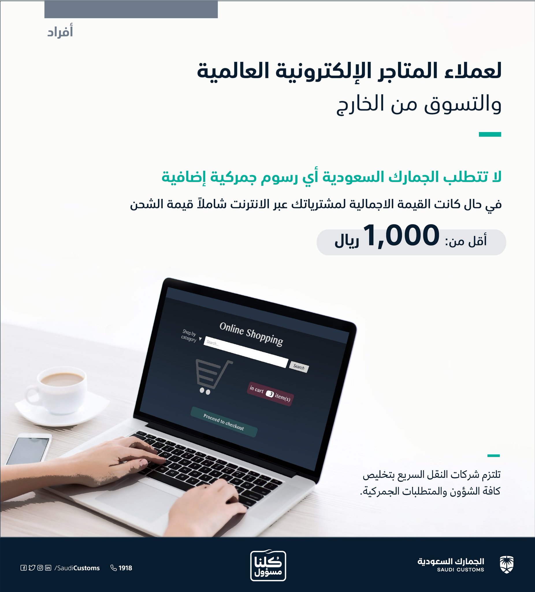الجمارك السعودية على تويتر في حال تسو قك من الخارج عبر الإنترنت بأقل من 1000 ريال شاملة أجور الشحن لن تقوم الجمارك السعودية باحتساب أي رسوم جمركية على المشتريات للمزيد حول الشراء من الخارج عبر الإنترنت Https T Co Qqkuic1vcm Https T Co