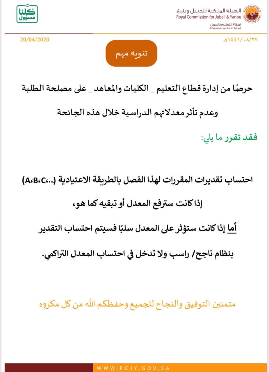 كلية الجبيل الجامعية On Twitter إعلان مهم لطلبة قطاع التعليم الهيئة الملكية الجبيل بشأن طريقة احتساب المعدل الدراسي