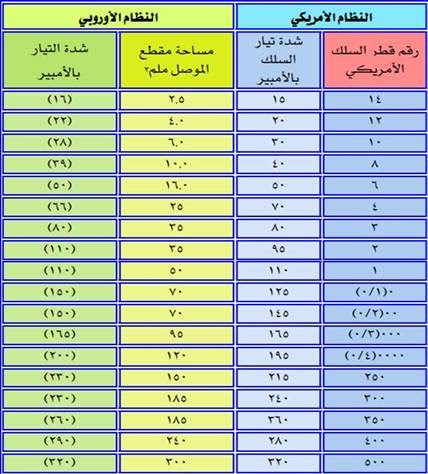 جدول مساحة مقطع السلك بنسة لشدة التيار بالقياس الامريكي والعالمي